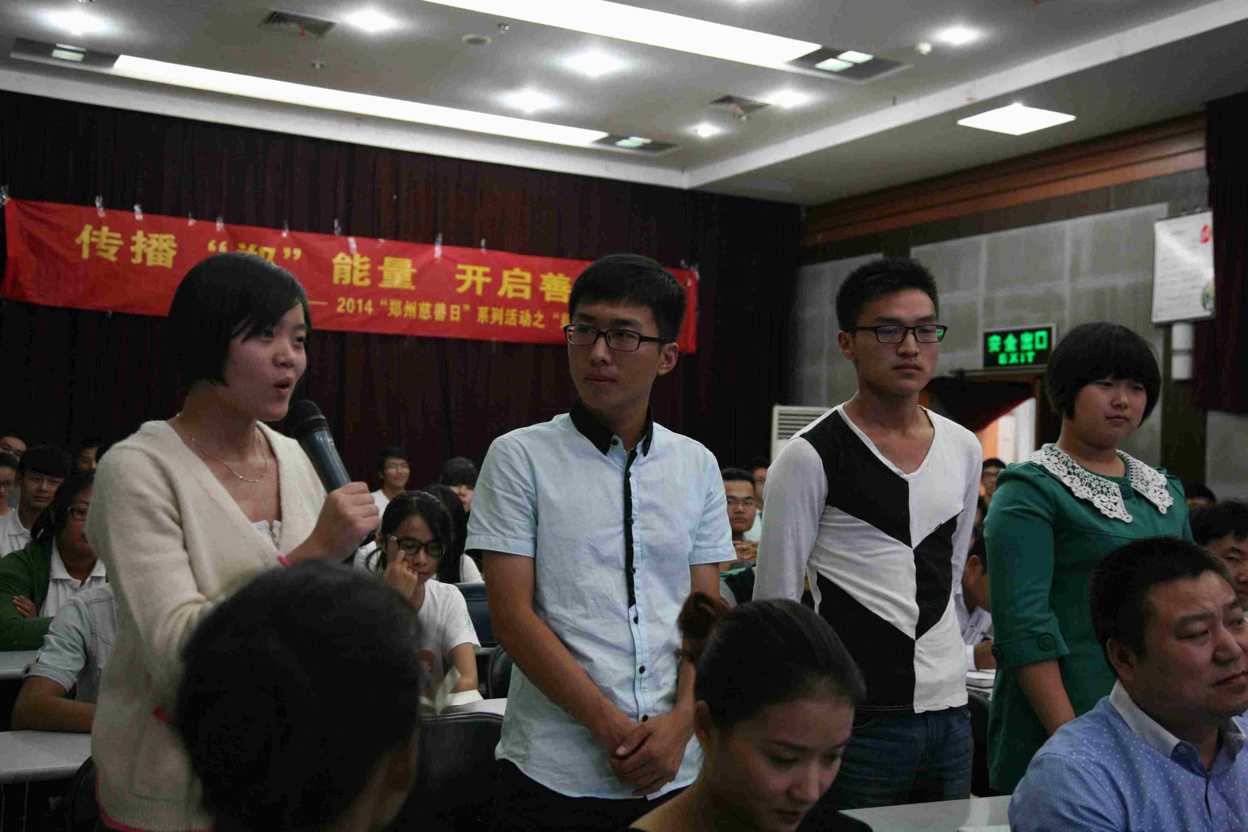 论坛的主题为“慈善与我,我与慈善”,每位参会嘉宾与同学们分别分享了慈善心得;2014郑州慈善总会“传递温暖 呵护夕阳”大学生养老护理员项目中的优秀学生代表以及慈善总会金翅公益联盟支教团队志愿者代表分别讲述了参加志愿服务中发生的动人故事与真情感悟。论坛现场掌声此起彼伏,一派温馨感人的氛围。