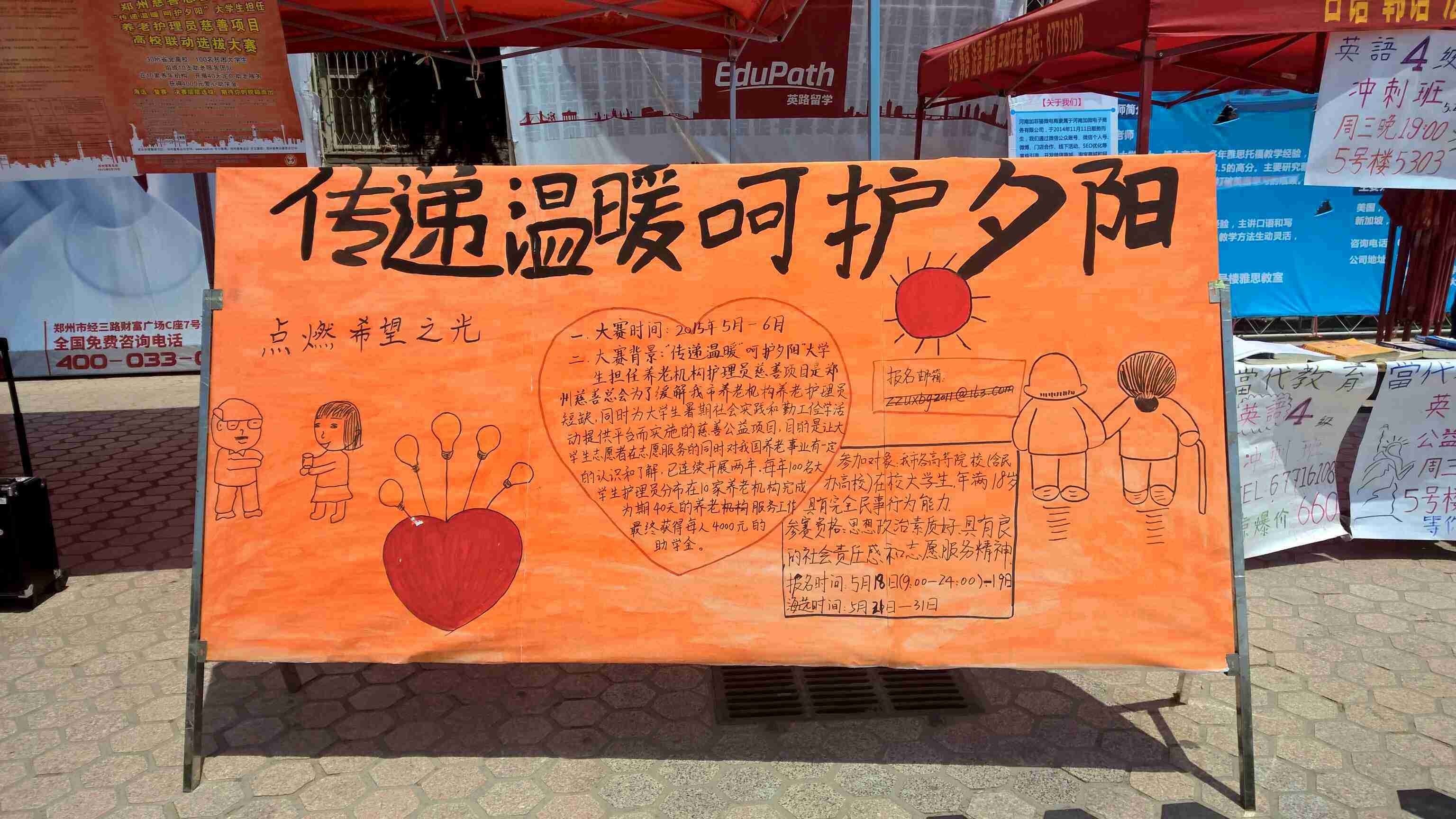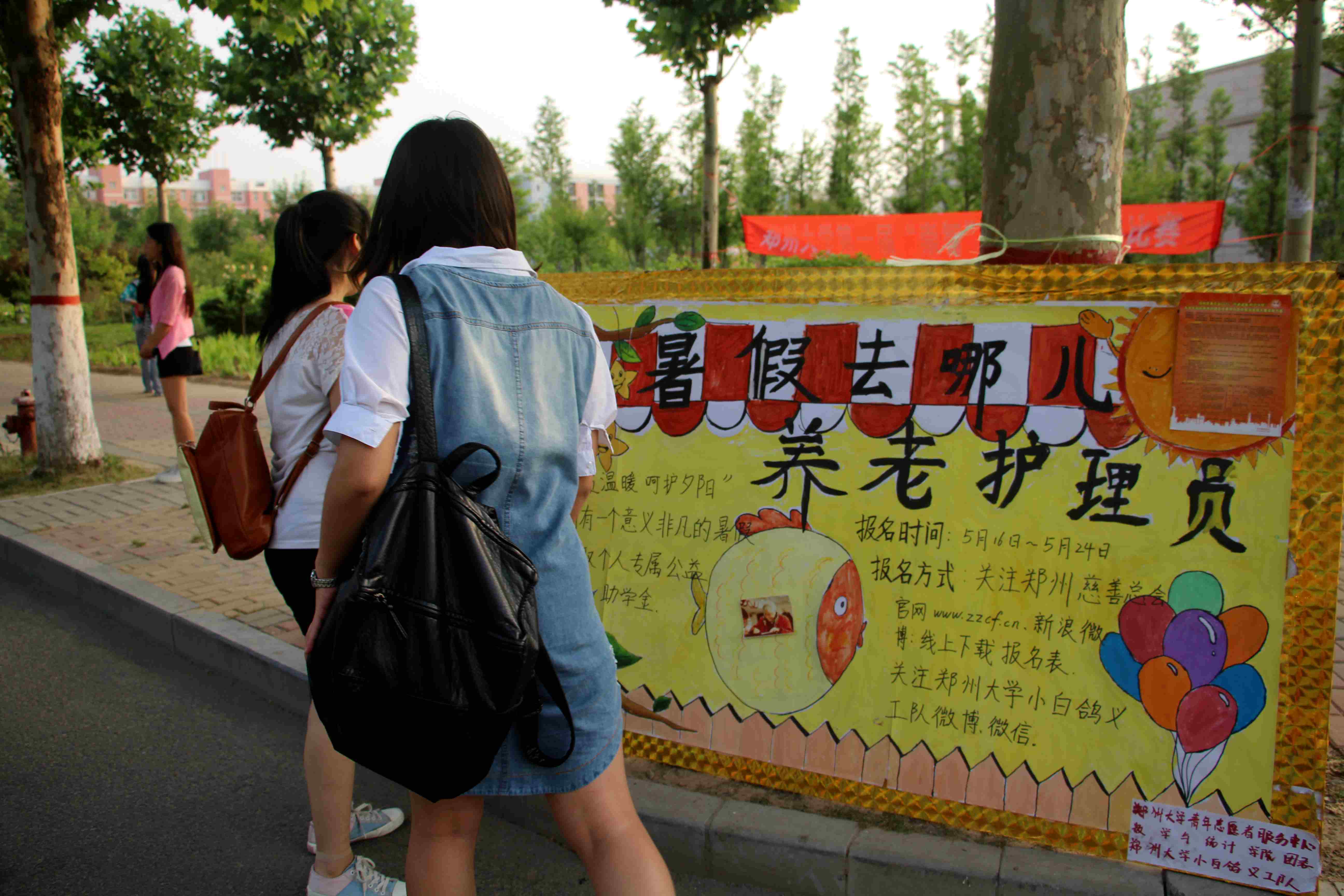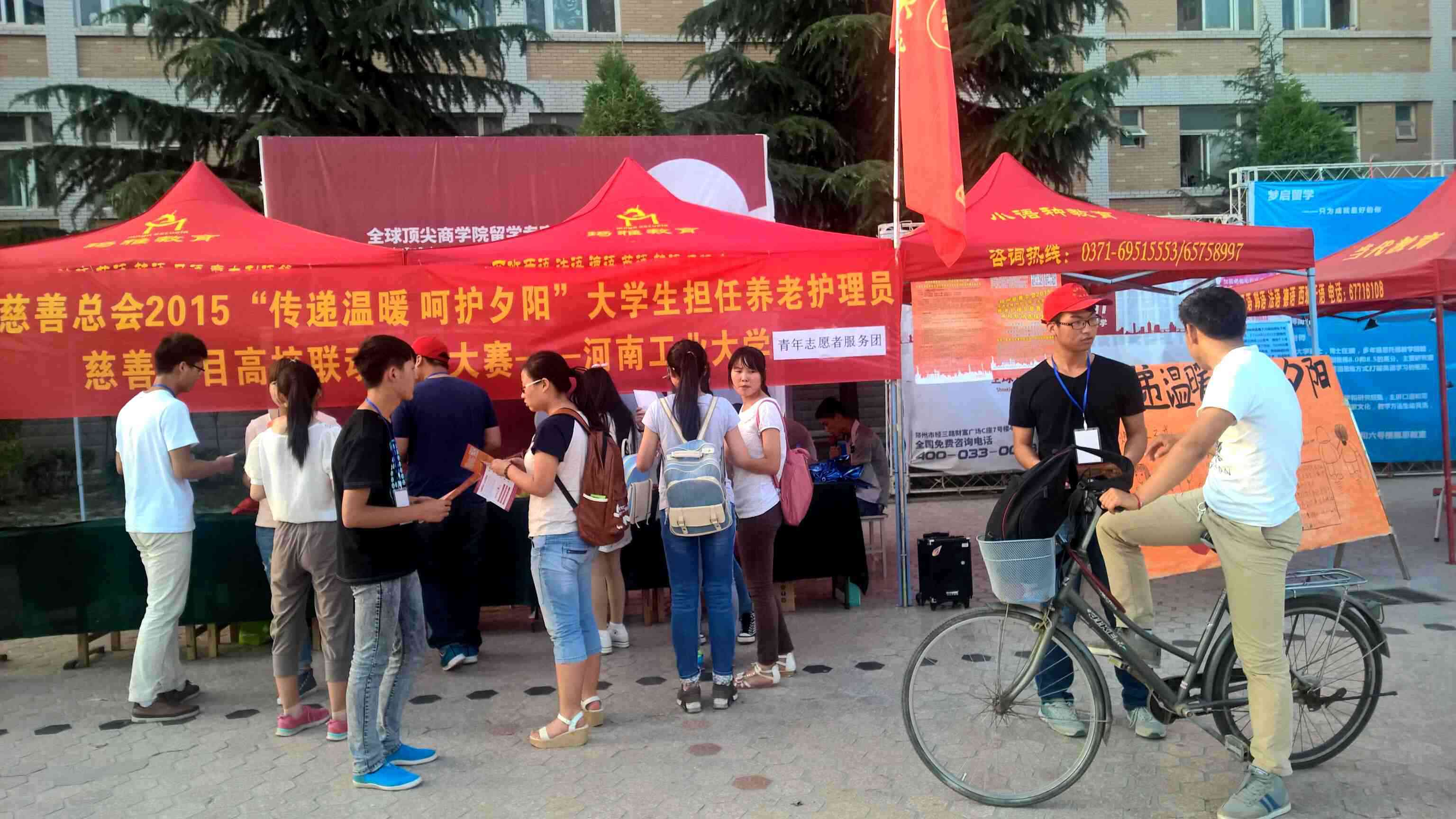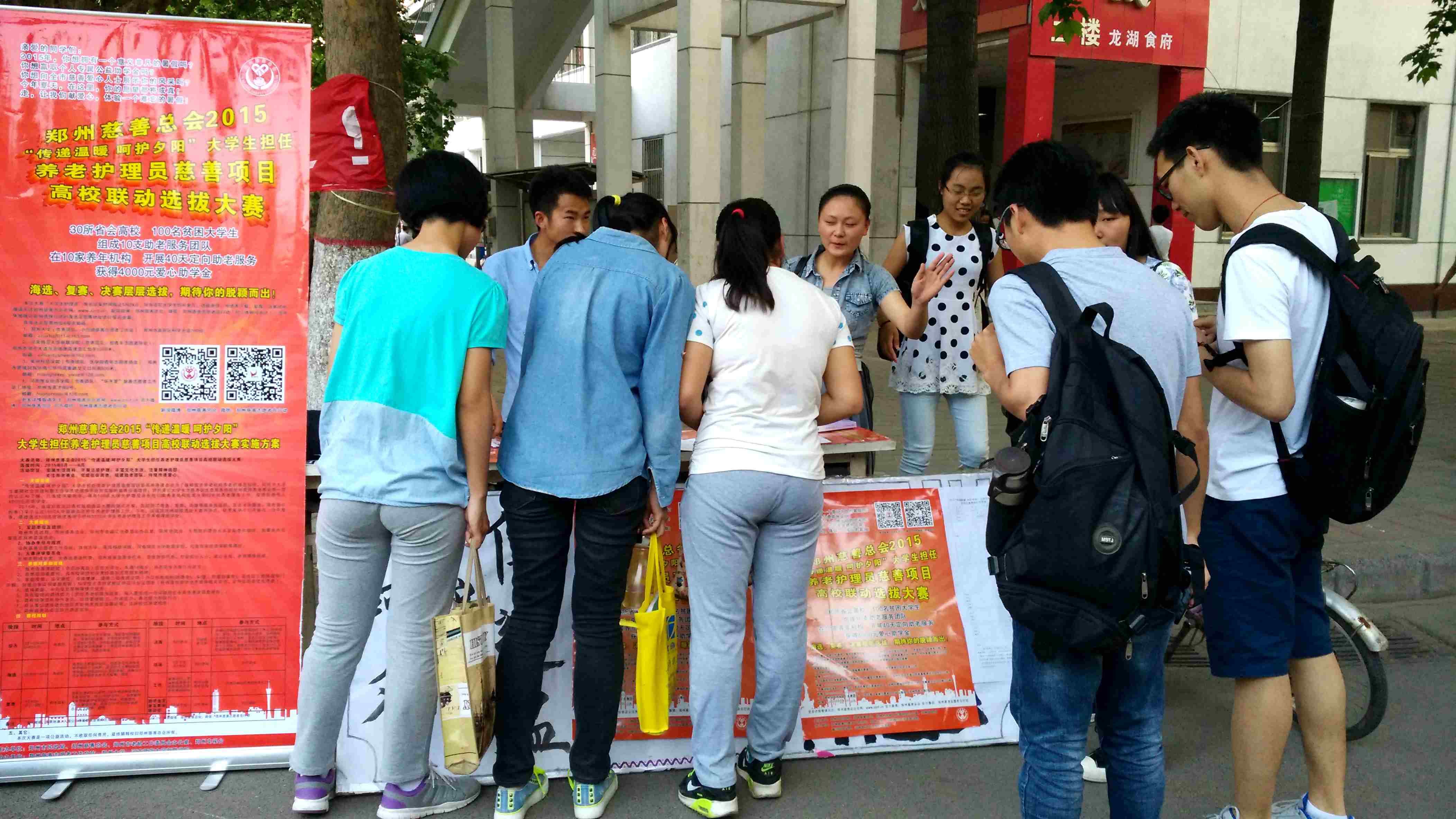 5月16日,郑州慈善总会启动2015“传递温暖 呵护夕阳”大学生担任养老护理员慈善项目高校联动选拔大赛。几天来,各高校志愿者积极开展外场宣传活动,号召学子们踊跃报名。现活动仍在招募中,报名时间为5月16日至24日,望广大符合条件学子积极踊跃参与。复赛将分别于郑州大学、河南师范大学新联学院、黄河科技学院以及河南牧业经济学院4所高校进行。有关大赛的最新消息请登录郑州慈善总会官网:www.pvbdsq.cn或关注新浪微博:郑州慈善总会、微信:郑州慈善志愿者在行动查询。小伙伴们还等什么?赶快行动吧!